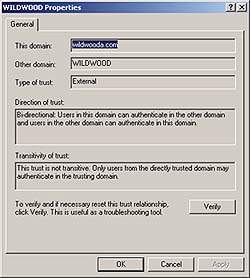 Система на базе Windows 2000 более интеллектуальна в плане организации доверительных отношений, нежели система NT 4.0. Для того чтобы отобразить статус доверительных отношений, нужно выбрать любой из доменов, участвующих в доверительных отношениях, и щелкнуть на кнопке Edit. Определить причину затруднений при работе через доверительное соединение возможно с помощью режима верификации (см. Рисунок 5). Для этого нужно щелкнуть на кнопке Verify, и тем самым обновить доверительные отношения доменов. Поскольку я выполняла загрузку одной и той же станции, но только в разных конфигурациях (как автономный сервер и как контроллер домена Windows 2000), мне приходилось часто использовать описанную выше функцию.Я таким образом подтверждала, что доверительные отношения с NT 4.0 все еще существуют, хотя контроллер домена Windows 2000 в течение нескольких дней был выключен.