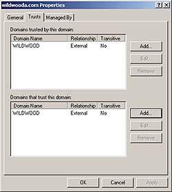 После тестирования DNS я решила проверить регистрацию между доменами Windows 2000 и NT 4.0. Установка явно определенных доверительных отношений между доменами Windows 2000 и NT 4.0 происходит точно так же, как в многодоменной среде сети NT. Что касается Windows 2000, то нужно сначала запустить утилиту Active Directory Domains and Trusts, которая сформирует список доменов Windows 2000. Затем следует щелкнуть правой кнопкой мыши на домене Windows 2000, для которого требуется установить доверительные отношения, выбрать Properties и, наконец, закладку Trusts. Экран, который при этом появится (см. Рисунок 4), будет иметь явное сходство с соответствующим экраном в NT 4.0. На Рисунке 4 показаны явные двусторонние доверительные отношения между доменами Windows 2000 (Wildwooda) и доменом NT 4.0 domain (Wildwood).