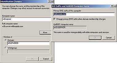 Чтобы указать имя компьютера Windows 2000 и его суффикс DNS, следует открыть контекстное меню My Computer, выбрать Properties, затем закладку Networking Identification и щелкнуть кнопку Properties для отображения окна Identification Changes. В этом окне задается имя хоста станции (т. е. имя сервера Windows 2000). Теперь нужно щелкнуть мышью на кнопке More, откроется диалоговое окно DNS Suffix and NetBIOS Computer Name, в котором требуется указать суффикс DNS (например, wildwooda.com). На Рисунке 3 приведены оба диалоговых окна. Затем следует ввести всю остальную информацию, связанную с настройками TCP/IP, в том числе адрес TCP/IP, шлюз, сведения о DNS и WINS (в закладке Properties для описания свойств адаптеров LAN). После того как, наконец, введен суффикс DNS, остается щелкнуть ОК для перезагрузки устанавливаемого сервера. После загрузки ОС рекомендую повторить запуск процедуры Ipconfig/all и убедиться в том, что суффикс DNS совпадает с тем, который только что был задан.