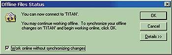В Windows 2000 Professional по умолчанию определено, что при подключении к LAN операционная система, убедившись в наличии доступа к сети, выдает диалоговое окно, содержащее запрос на синхронизацию содержимого каталога. После этого с небольшой задержкой становится доступным все содержимое сетевого каталога на сервере. Однако когда я подключился к сети, этого не произошло. По завершении синхронизации содержимое каталога по-прежнему отображалось в сокращенном варианте. Тогда мне удалось найти второй способ, как заставить систему показывать полный список файлов в каталоге. Для этого достаточно, открыв каталог Offline Files Folder, выдать два запроса на синхронизацию. В результате после небольшой паузы появится полный список файлов и каталогов.
