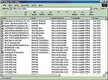 В поездке мне предстояло работать с файлами из нескольких различных каталогов. Поэтому я отметил каждый из этих каталогов для автономного использования, щелкнув на них правой клавишей мыши и выбрав Make Available Offline. Во время поездки я работал с данными файлами, синхронизируя все изменения, подключившись через модем и (после возвращения в офис) по локальной сети. И хотя в этой поездке мне пришлось столкнуться с некоторыми небольшими проблемами при работе с Offline Files и RAS, я считаю, что Windows 2000 Offline Files - это потрясающая вещь.