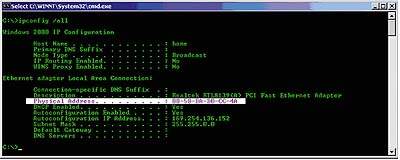| Экран 1. Поле Physical Address показывает MAC-адрес сетевой карты. |