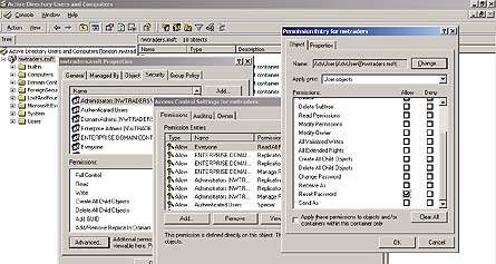 Вопрос: У меня на работе есть домен на Windows 2000 в mixed mode, и я хочу дать пользователю AdvUser только права на изменение паролей всех пользователей домена. Я понимаю, что это делается через делегирование полномочий. Все пользователи находятся в разных OU. Я создаю новую OU, перемещаю туда пользователя AdvUser (он принадлежит только к группе Domain Users) и делегирую данной OU права на изменение паролей группы Domain Users. Но когда я вхожу под учетной записью этого пользователя, я не могу ничего изменить. Где я ошибаюсь?