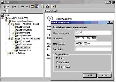 В службах DHCP (и NT 4.0 + SP2 и Windows 2000) существует возможность создания нескольких логических IP-сетей на одном физическом сегменте. Для этого необходимо объединить в одну суперобласть (superscope) несколько созданных ранее областей (scopes). Однако регулировать, какие именно