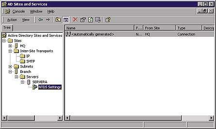После того как топология узла определена, Windows 2000 создает соединения репликации. AD содержит службу KCC - Knowledge Consistency Checker, которая выполняется на всех контроллерах домена и создает объекты «соединение» между всеми контроллерами домена в лесу. Объекты «соединение» управляют трафиком репликации между контроллерами домена. KCC строит эти объекты внутри узла таким образом, чтобы путь между двумя контроллерами домена не занимал более трех переходов (hop). На Рисунке 3 показано окно подключаемого модуля AD Sites and Services, в правой панели которого отображено соединение, автоматически созданное KCC для сервера SERVERA узла BRANCH.