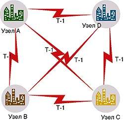 Узлы соединяются между собой связями - каналами, формирующими группы узлов. На Рисунке 2 изображена схема компании, имеющей четыре региональных центра дистрибуции. В каждом центре рабочие станции и контроллеры доменов объединены скоростной локальной сетью. Каждый из центров соединен с другими центрами линиями T-1. Каждый центр представляет собой узел. В данном случае администратор AD соединил все узлы между собой, поскольку соединения между узлами имеют одинаковую пропускную способность. При описании связей узлов можно указать расписание в рамках каждой связи и стоимость обмена. Расписание определяет частоту и время репликации данных между узлами, стоимость представляет произвольное значение, которое устанавливает приоритет подключения между узлами.