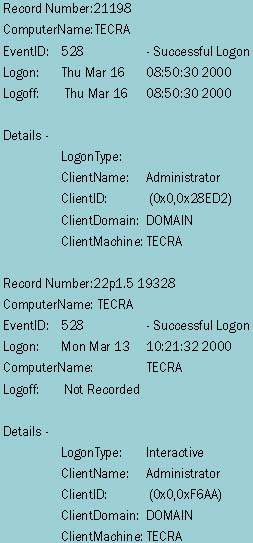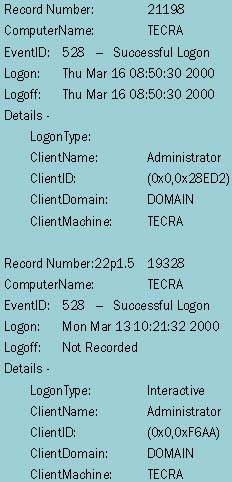В первой части приводятся данные о каждом сеансе - имя пользователя, название компьютера, на котором пользователь открыл сеанс, тип сеанса, его дата и время, а также дата и время завершения сеанса. К сожалению, Windows NT не всегда фиксирует события с кодом 538, т. е. событий 528 в журналах обычно больше, чем 538.