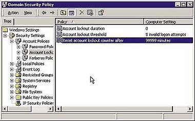 Шаг 3. Чтобы поставить дополнительные преграды «взломщикам», нужно использовать возможность блокировки Computer Configuration Windows SettingsSecuritySettingsAccount Lockout Policy (см. Рисунок 4). Комбинация значений, которая приведена на Рисунке 4 для параметров Account lockout duration и Account lockout threshold, означает, что если в течение 24 часов будет обнаружено пять последовательных неудавшихся попыток регистрации с неправильным паролем, операционная система заблокирует учетную запись пользователя. Поскольку значение параметра Account lockout duration установлено в 0, учетная запись останется заблокированной до тех пор, пока пользователь лично не попросит администратора разблокировать ее. Если же требуется, чтобы блокировка учетной записи снималась автоматически через некоторое время, следует указать временной период в параметре Account lockout duration.