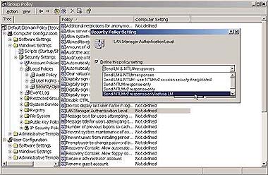 В Windows 2000 можно воспользоваться групповой политикой для управления значением параметра LMCompatibilityLevel. По адресу Computer ConfigurationWindows SettingsSecurity SettingsLocal PoliciesSecurity Options находится политика, которая носит название LAN Manager Authentication Level. На Рисунке 2 приведены реальные настройки для нее. Когда администратор системы описывает какое-либо значение для этой политики в Group Policy Object (GPO), операционная система Windows 2000 параллельно устанавливает некоторое значение для параметра LMCompatibilityLevel в реестре всех систем, к которым применяется объект GPO. Если требуется установить определенное значение параметра LMCompatibilityLevel как некий стандарт для всех компьютеров домена, следует обратиться к Active Directory Users and Computers в Microsoft Management Console (MMC), открыть окно свойств корневого домена и щелкнуть на закладке Group Policy. Далее необходимо последовательно открыть Default Domain Policy GPO и диалоговое окно политики LAN Manager Authentication Level, которое изображено на Рисунке 2. После чего в качестве минимальной меры защиты протокола NTLM нужно выбрать из предлагаемого списка значений опцию Send LM & NTLM - use NTLMv2 session security if negotiated.