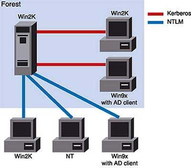 | Рисунок 1. Windows 2000 использует для аутентификации Kerberos и NTLM. |