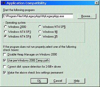 На CD-ROM с NT 4.0 Microsoft поставляет командный файл setwin95.cmd. После его запуска программа исходит из того, что она работает не в NT, а в Windows 95. Эта же идея воплощена Microsoft в утилите Application Com-patibility (apcompat.exe). На Экране 2 показана графическая оболочка утилиты, а сам файл находится на CD-ROM с Windows 2000 в каталоге Support. Утилита Apcompat.exe устанавливается вместе с другими программами поддержки.