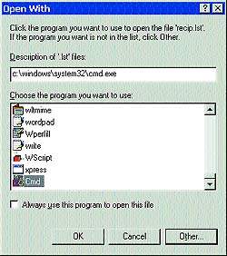 Для этого во время настройки TCP/IP-стека следует перейти на закладку WINS и щелкнуть на кнопке Import LMHOSTS. Откроется диалоговое окно Open With, показанное на Экране 3. Нужно щелкнуть правой кнопкой мыши на любом файле, для которого еще не определена связь с программой просмотра, и выбрать пункт меню Open With. Затем щелкнуть на кнопке Other, перейти в папку \%systemroot%system32 и выбрать программу cmd.exe. Флажок Always use this program to open this file выставлять не нужно, так как постоянную ассоциацию создавать не требуется. Далее щелкаем на кнопке OK, и NT открывает командное окно. Фокус в том, что вместо файла открылось командное окно.