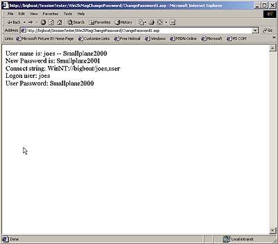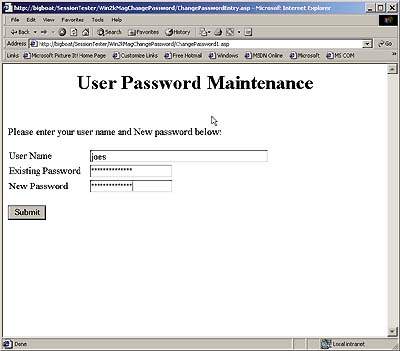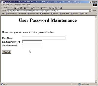 ChangePasswordEntry.asp - это HTML-файл, который объединяет следующую информацию: имя пользователя, существующий пароль и новый пароль. После того как пользователь вводит эти данные и нажимает кнопку Submit, управление передается в Change Password1.asp. Этот файл содержит код, приведенный в Листинге 2. Именно этот код фактически меняет пароль пользователя.