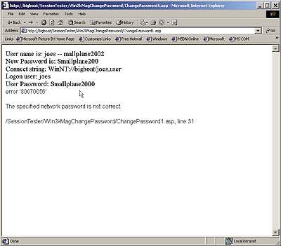 На Экране 2 изображена форма, соответствующая коду Change Password-Entry.asp. Я ввел в нужные поля имя пользователя (заголовок поля - User Name), текущий пароль (Existing Password) и новый пароль (New Password). Когда нажимается кнопка Submit, код ChangePass-word1.asp начинает исполняться. На Экране 3 показан результат работы оператора Response.Write. Если бы текущий пароль был введен неправильно, то ADSI сообщил бы об этом (см. Экран 4). Следует отметить, что ADSI не позволяет пользователям без соответствующих полномочий изменять свои пароли.