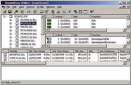 Основная трудность при перенаправлении DLL - отыскать зависимые компоненты прикладной программы. Эту задачу легче выполнить с помощью утилиты Dependency Walker (depends.exe), поставляемой в составе пакета Windows 2000 Support Tools (программа установки Support Tools находится в папке support ools на компакт-диске Windows 2000 Pro или Windows 2000 Server) или Microsoft Visual Studio (VS). На Экране 1 показано, как использовать Dependency Walker для поиска компонентов исполняемого файла scan32.exe, составной части программы VirusScan компании Network Associates. В левом верхнем окне показаны все зависимые DLL для файла scan32.exe. При подготовке приложения для перенаправления DLL по этому списку можно проверить, все ли зависимые компоненты установлены в каталоге приложения. Однако необходимо убедиться, что компоненты, устанавливаемые вместе с приложением, принадлежат только этой программе и не относятся к числу разделяемых компонентов Microsoft. Например, WFP защищает основные системные файлы, такие, как mcf40.dll, поэтому их необходимо оставить в каталоге winntsystem32, куда они были установлены системой Windows 2000. (Сведения о других средствах «укрощения» DLL приведены во врезке «Ресурсы для изгнания DLL-демонов».)