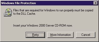 Если в папке dllcache нужные защищенные файлы отсутствуют, SFC запрашивает компакт-диск с Windows 2000, как показано на Экране B. Если Windows 2000 была установлена с доступного в данный момент сетевого узла или диска CD-ROM, то сообщение не выводится, поскольку SFC автоматически обращается в сеть или к накопителю CD-ROM за нужными файлами. Обнаружив файлы, SFC копирует их в папку dllcache, где они и хранятся до тех пор, пока не понадобятся системе.