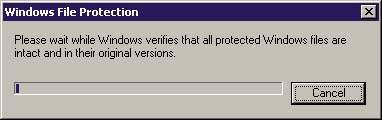 При запуске SFC с ключом /scannow утилита немедленно приступает к сканированию и выводит на экран диалоговое окно WFP, показанное на Экране A. В диалоговом окне отображается процесс проверки защищенных файлов. Операцию можно в любой момент остановить, щелкнув на кнопке Cancel диалогового окна. На ноутбуке со 150-мегагерцевым процессором Pentium и 144 Мбайт ОЗУ проверка продолжалась более часа. При необходимости система исправляет файлы в процессе работы.