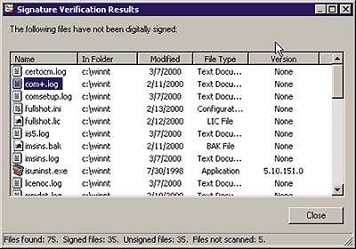 Чтобы начать процедуру проверки, следует запустить Sigverif и щелкнуть на кнопке Start. На Экране A показаны результаты проверки сервера. В список внесены файлы без цифровых сигнатур. Большинство таких файлов имеют расширения .log и .ini; они не имеют сигнатур, поскольку не относятся к числу исполняемых. Однако исполняемые файлы без сигнатур могут вызывать неисправности в системе. Обнаруженные файлы без сигнатур можно оставить без изменений, удалить или заменить.