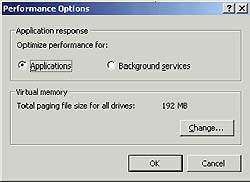 Хотя длительности квантов NT 4.0 вполне адекватны типичным ситуациям использования NT Workstation и NT Server, бывают случаи, когда продолжительность кванта не соответствует решаемой задаче. В такие моменты падает производительность работы приложений, снижаются масштабируемость и скорость реакции системы при взаимодействии с пользователем. Windows 2000 предоставляет администраторам возможность выбрать оптимальную продолжительность кванта для текущей нагрузки в любой версии. Диалоговое окно Performance Options (модуль System панели управления), показанное на Экране 1, позволяет администратору оптимизировать производительность приложений или фоновых служб. При оптимизации производительности приложений продолжительность кванта задается так же, как в NT Workstation 4.0 (т. е. фоновые потоки получают квант продолжительностью в два интервала планировщика, а активные приложения — шесть). Оптимизация производительности работы фоновых служб аналогична назначению квантов в NT Server 4.0 (квант длиной 12 интервалов для всех приложений).