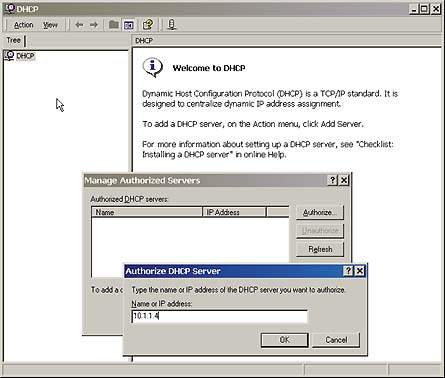 Если базовая архитектура сети соответствует требованиям Windows 2000 и AD, предстоит выполнить авторизацию всех RIS-серверов в каталоге AD в качестве уполномоченных DHCP-серверов. Этот шаг необходим, так как RIS - это служба, интегрированная в структуру AD, а значит, требуется, чтобы RIS-клиенты и серверы подтверждали свои полномочия в AD. Хотя RIS и DHCP - не одно и то же, серверы RIS авторизуются в AD при помощи программы DHCP Management, как если бы это были обычные DHCP-серверы. Если служба RIS устанавливается на DHCP-сервер, то авторизация выполняется автоматически и дополнительно ничего делать не требуется. Для авторизации сервера RIS как сервера DHCP в AD нужно выполнить следующие действия.