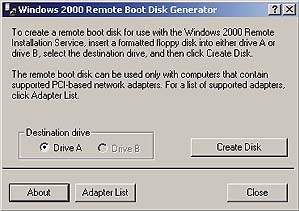 Станции клиентов используют специальную технологию сетевой загрузки, Preboot Execution Environ-ment (PXE), которая позволяет локализовать RIS-сервер и загрузить образ ОС. Технология PXE может поддерживаться или системным BIOS клиента, или сетевым адаптером (поддержка PXE - составная часть NetPC и промышленной спецификации PC98 0.6 или более поздней, но для RIS требуется версия PXE .99c или более поздняя). Для систем, не поддерживающих PXE, Microsoft предоставляет утилиту Remote Boot Floppy Generator (RBFG) - генератор диска удаленной загрузки. Эта программа обеспечивает поддержку PXE для некоторого числа сетевых PCI-адаптеров.