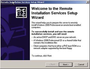 После перезагрузки сервера конфигурация службы RIS еще не настроена. Сразу после регистрации система автоматически запустит программу Remote Installation Services Setup Wizard (risetup.exe), окно которой изображено на Экране 2. Программа последовательно выполнит настройку RIS и подготовит образы ОС для клиентов сети.