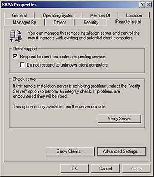 Или другой вариант: на станции управления можно установить RIS-компонент, запустив программу установки RIS, но прервав работу мастера установки в тот момент, когда появится окно настройки конфигурации. Этого будет достаточно для изменения диалогового окна Properties и появления закладки Remote Install в оснастке Active Directory Users and Computers.