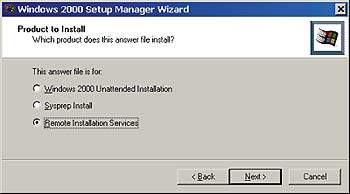 Когда система готова, можно запускать утилиту RIPrep на компьютере-образе. При установке службы RIS эта утилита автоматически копируется в сетевой каталог RemInst каждого RIS-сервера:\RIS_serverRem-InstAdmini386Riprep.exe. При запуске этой программы стартует мастер установки Windows 2000 Setup Manager Wizard (см. Экран 4).