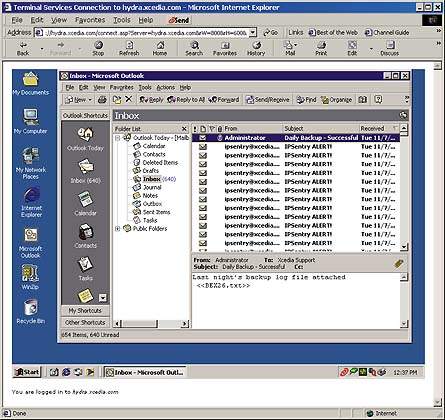 Было нелегко избежать сравнений между продолжительными сеансами синхронизации Outlook и быстрыми подсоединениями к Outlook через терминальный сервер. На Экране 1 показан сеанс TSAC, выполняющийся на Windows 2000 Professional, с доступом к Outlook 2000. Скорость связи с использованием клиента терминального сервера, по модемным RAS-соединениям оказалась на удивление высокой. Со временем я начал пренебрегать процессом синхронизации Outlook, склоняясь в пользу соединения с терминальным сервером и выполнения основной работы с почтой в оперативном режиме.
