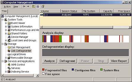 Как выполняется дефрагментация жесткого диска? В средах Windows 2000 и Windows 9x процедуры дефрагментации жесткого диска аналогичны: нужно выбрать в меню Start пункты ProgramsAccessoriesSystemToolsDisk Defragmenter. Кроме того, доступ к этому средству дефрагментации можно получить из раздела Storage модуля Computer Management, представленного на Экране 4, а также из закладки Tools списка свойств Properties соответствующего диска.
