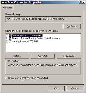 Как установить новые протоколы, сетевые драйверы и службы? Чтобы установить новый протокол, нужно открыть папку Network and Dial-up Connections и щелкнуть правой клавишей мыши на значке Local Area Connections. Затем в раскрывшемся контекстном меню следует выбрать пункт Properties, после чего появится диалоговое окно, показанное на Экране 6. Для установки службы, клиента или сетевого протокола нужно нажать Install, а затем выбрать тип программного средства, который требуется установить (также делается и в среде Windows 9x).