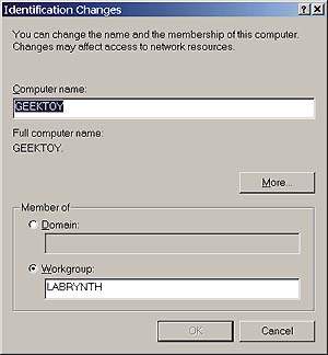 При изменении имени компьютера или при выполнении таких операций, как присоединение к домену или рабочей группе, вполне можно положиться на мастер Network Identification. Но есть еще один способ, который искушенные пользователи, пожалуй, сочтут более удобным: нужно открыть окно модуля System, перейти на закладку Network Identification и щелкнуть на пункте Properties - откроется диалоговое окно Identification Changes, представленное на Экране 5.