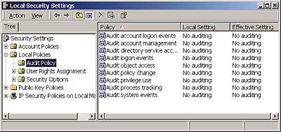 Если открыть журнал регистрации событий, обнаружится, что в разделе Security нет ни одной записи. По умолчанию Windows 2000 не регистрирует данные, связанные с защитой информации. Чтобы изменить эту установку, нужно применить к компьютеру групповую политику. Требуется открыть раздел Local Security Policy в Administrative Tools и выбрать элементы Local Policies и Audit Policy, как показано на Экране 8. Правой клавишей мыши следует щелкнуть на правиле (policy) и в раскрывшемся контекстном меню выбрать пункт Security; так можно указать регистрируемые события по собственному усмотрению. Впрочем, не стоит увлекаться: регистрацию успешного (штатного) завершения операций нужно назначать с особой осмотрительностью, иначе система начнет регистрировать такое количество событий, что в журнале нельзя будет разобраться.