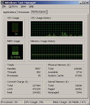 Надо сказать, что в Windows 2000 не предусмотрено важное средство, входящее в состав Windows 9x: программа Resource Meter, предназначенная для отображения в реальном времени данных об использовании системных ресурсов. По функциональности к этой программе ближе всего модуль Task Manager; для его запуска необходимо нажать комбинацию клавиш Ctrl+Alt+Del и в появившемся диалоговом окне выбрать элемент Task Manager. Для прекращения работы вышедших из-под контроля процессов Task Manager подходит больше, чем средство Close Program операционной системы Windows 9x. Однако следует иметь в виду, что при раскрытом окне Task Manager отображает краткий список данных об использовании процессора и памяти на протяжении некоторого периода времени, а в свернутом окне представлен только коэффициент загрузки ЦП на данный момент(см. Экран 7).
