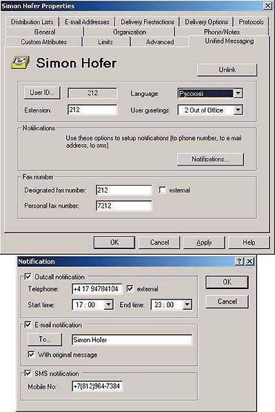 - cоздание нового речевого/факсимильного почтового ящика на Smartphone Server для пользователя Microsoft Exchange Server;