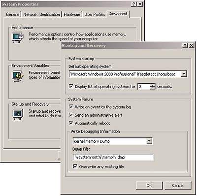 Копия содержимого системной памяти в момент сбоя часто содержит информацию, которая для анализа не пригодится. Сбой вызывается ошибкой в работе приложения режима ядра, поэтому данные о выполнении приложения пользовательского режима, как правило, не имеют отношения к аварии. К памяти режима ядра относятся все структуры данных операционной системы и драйверов, а также исполняемый код драйверов устройств и ядра, поэтому в Windows 2000 реализована возможность сохранения в аварийном дампе только памяти режима ядра. Это позволяет существенно уменьшить размеры файла аварийного дампа, его можно быстрее создать и копировать, проще хранить и пересылать обслуживающему персоналу. На типичной машине емкостью памяти 128 Мбайт размер дампа памяти ядра может составлять всего 40 Мбайт. На Экране 2 показано окно параметров аварийного завершения Startup and Recovery операционной системы Windows 2000, которое можно увидеть, щелкнув на кнопке Startup and Recovery закладки Advanced приложения System.