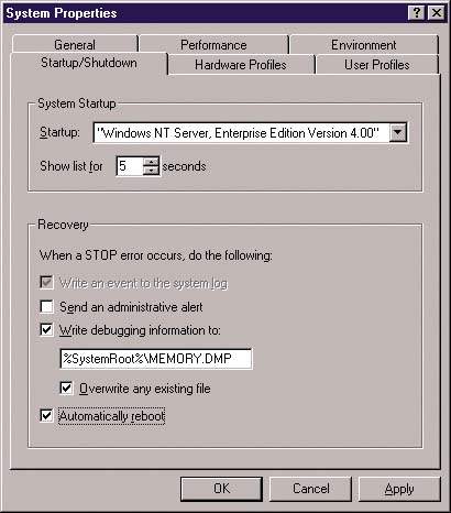 Поскольку в файлах аварийных дампов NT 4.0 хранится копия данных из физической памяти компьютера, необходимо убедиться, что на диске достаточно места для записи дампа. Во-первых, следует настроить файл подкачки на загрузочном томе (на котором находится каталог winnt). Размер файла подкачки должен быть больше, чем объем системной памяти плюс 1 Мбайт. Свободное пространство тома, на котором хранится файл дампа (по умолчанию он же загрузочный том), должно быть немного больше объема физической памяти компьютера.