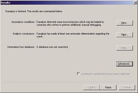 Я не рекомендую просматривать область Anomalous conditions страницы Results. Модули Plug-in многие ситуации необоснованно воспринимают как подозрительные. На странице результатов имеется кнопка View для области Information from data base (информация из базы данных), с помощью которой можно сравнить полученную информацию о сбое с информацией из базы данных. Если на машине SQL Server не установлен, воспользоваться этой функцией невозможно.