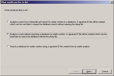 Программа потребует указать местоположение анализируемого дампа и местоположение символьных файлов. Если SQL Server не установлен и пользователь не собирается работать с базой данных Kanalyze, то на странице «What would you like to do?», показанной на Экране 3, следует выбрать второе положение переключателя.