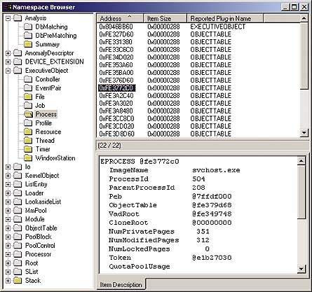 Последняя кнопка на странице результатов, Advanced, обеспечивает просмотр обнаруженных элементов; ею можно воспользоваться для ручного анализа. Элементы разделены по типам, далее в иерархической структуре расположены задаваемые подключаемыми модулями подэлементы. Например, папка Module, которую создает модуль Module, имеет подпапки для областей памяти, занимаемых программным кодом драйвера и ядра, данными и заголовком изображения (содержащим информацию о структуре изображения). Может быть полезной подпапка Process папки ExecutiveObject, показанная на Экране 6. В ней перечислены все процессы, выполняемые в системе в момент сбоя, и собрана подробная информация об использовании памяти каждым процессом.