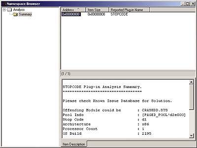 Если кнопка View в области Analysis Conclusions страницы Results доступна, значит, один или несколько подключаемых модулей определили вероятную причину сбоя. Если запустить Kanalyze для обработки дампа, созданного программой BSOD, то кнопка View активизируется, как показано на Экране 4. По щелчку на кнопке View на экран выводится окно Namespace Browser со списком обнаруженных ошибок, показанное на Экране 5. В окне содержится сообщение, что сменный модуль STOPCODE считает «виновником» сбоя драйвер crashdd.sys. В окне Namespace Browser даже показан снимок стека (на Экране 5 не виден), из которого ясно, что функция IopLoadUn-loadDriver в Ntoskrnl (ядро) вызвала функцию в crashdd.sys, а crashdd.sys затем вызвала KiTrap0E в Ntoskrnl. Если в аварийном дампе обнаружена функция, в названии которой есть слово Trap или Exception, значит, скорее всего, программный код ядра обратился к неверному указателю, что и привело к краху системы. Если сбой вызван программой BSOD, обращение crashdd.sys к неверной области памяти приводит к вызову trap-функции (реакция на исключительную ситуацию), и Kanalyze точно определяет причину сбоя.
