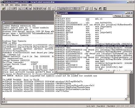 Если с помощью Kanalyze определить причину сбоя не удается, аварийный дамп можно исследовать вручную, пытаясь отыскать детали, ускользнувшие от внимания Kanalyze. Для ручного анализа предназначены два инструмента из набора OEM Support Tools: WinDbg (или Win Debug) и Kd (в ранних версиях называвшийся i386kd). Эти утилиты имеют идентичные наборы команд и функции работы с данными в дампе, только WinDbg - графическое приложение Windows, а Kd - программа, запускаемая из командной строки. Я рекомендую работать с WinDbg, в которой проще копировать значения и использовать подокна.
