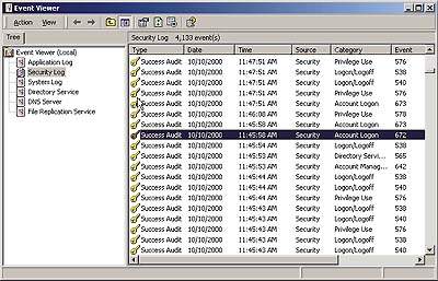 Windows 2000 генерирует событие с ID 673 еще в нескольких случаях. Во-первых, это событие часто имеет место при взаимодействии между системами; оно легко узнаваемо, так как в поле User Name помещается имя компьютера. Примером может служить ситуация, когда станция подключается к контроллеру домена для получения информации о групповой политике.