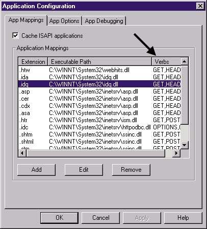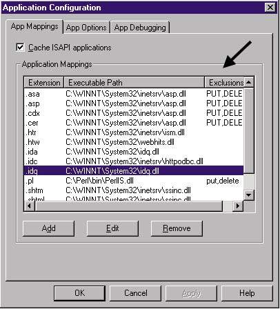 Экран 2 иллюстрирует вкладку App Mappings для IIS 5.0, а Экран 3 - для версии IIS 4.0. Стрелки, указывающие на правые колонки на том и другом экране, подчеркивают существенное различие между IIS 5.0 и IIS 4.0. Колонки озаглавлены по-разному: для IIS 5.0 - это Verbs, а для IIS 4.0 - Exclusions. По умолчанию, IIS 5.0 не разрешает использовать новые команды (verbs) в спецификации HTTP. Устанавливая связь приложение-исполняемый модуль, нужно указать команды, разрешенные системой для работы с HTTP. Сервер IIS 4.0, наоборот, по умолчанию разрешает использовать новые команды. Поэтому для IIS 4.0 нужно указать команды, запрещенные системой (исключения).