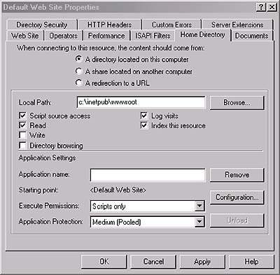 Чтобы добраться до вкладки App Mappings в IIS 5.0 или IIS 4.0, нужно выбрать вкладку Home Directory в окне Default Web Site Properties, щелкнуть Configuration и затем App Mappings. Того же результата можно добиться путем установки произвольного виртуального каталога в качестве приложения.