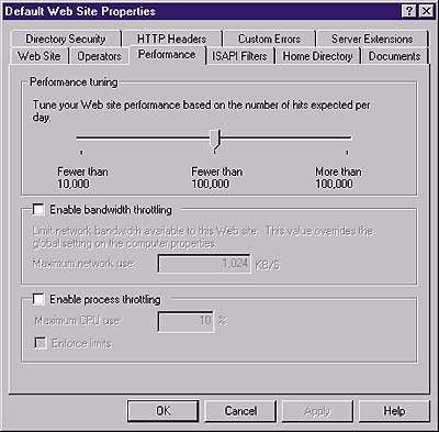 В файле Readme из состава IIS 5.0 (см. статью Microsoft «Contents of Internet Information Server 5.0 Release Notes» по адресу: http://support.microsoft.com/ support/kb/articles/q250/9/79.asp) показаны скрытые различия в организации пула сокетов. Если для повышения производительности системы выполняется тонкая настройка одного из Web-сайтов, работающих на пул, это неизбежно оказывает воздействие и на все остальные Web-сайты в пуле сокетов. Отрегулировать параметры производительности Web-сайта можно на вкладке Performance в окне Default Web Site Properties, как показано на Экране 4.