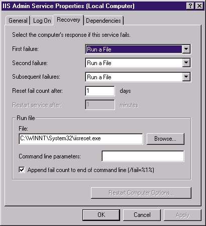 Если IIS 5.0 не отвечает, можно запустить IISReset через Windows 2000 Service Control Manager (SCM). Для активизации этой возможности следует открыть контекстное меню IIS Admin Service приложения IIS 5.0 Services, выбрать Properties и щелкнуть на вкладке Recovery (см. Экран 6). На экране приведены установки по умолчанию, но при необходимости можно описать процедуру восстановления и задать необходимые временные параметры. На Экране 6 указано, что при любом сбое (первом, втором и всех последующих) будет вызываться программа IISReset. В поле Run file описывается файл, запускаемый после каждого сбоя (в данном случае указан C:WINNTSystem32iisreset.exe). Администратор может задать различные действия после первого, второго и всех последующих сбоев, а также вызвать специально разработанную программу, которая перезапустит остальные процессы, запишет нужные сообщения в журналы событий или оповестит обслуживающий персонал. Для вывода всех параметров, перечисленных в документации на IIS 5.0 для команды IISReset, достаточно просто набрать в командной строке: