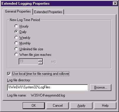 IIS 5.0 обладает новым свойством, разрешающим проблему перехода даты. В окне Properties Web-сайта нужно последовательно выбрать вкладку Web Site, Enable Logging, W3C Extended Logging Format как Active Log Format и щелкнуть Properties. На вкладке General Properties в окне Extended Logging Properties (см. Экран 5) можно установить флажок Use local time for file naming and rollover, чтобы журнальные файлы формировались с учетом перехода даты в локальной временной зоне. Но вот датировка самих записей внутри файлов по-прежнему соответствует Гринвичу. Напоминаю, что сказанное относится к IIS 5.0.