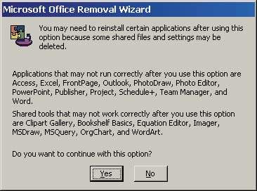 Утилиту можно загрузить по адресу: http://download.microsoft.com/download/ office2000/utility/2.1/win98/enus/eraser2k.exe. Запустив самораспаковывающийся иcполняемый файл и записав шесть извлеченных из него файлов в каталог, выполните программу eraser2000.exe, чтобы активизировать утилиту Microsoft Office Removal Wizard. Прежде, чем начать процесс очистки, программа запрашивает подтверждение, как показано на Экране 2.