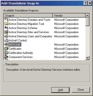 Доступ к оснастке ADSI Edit можно получить из меню оснасток ConsoleAdd/Remove, как показано на Экране 1. Теперь можно использовать консоль ADSI Edit для изменения объектов AD и атрибутов.